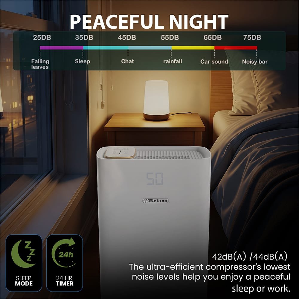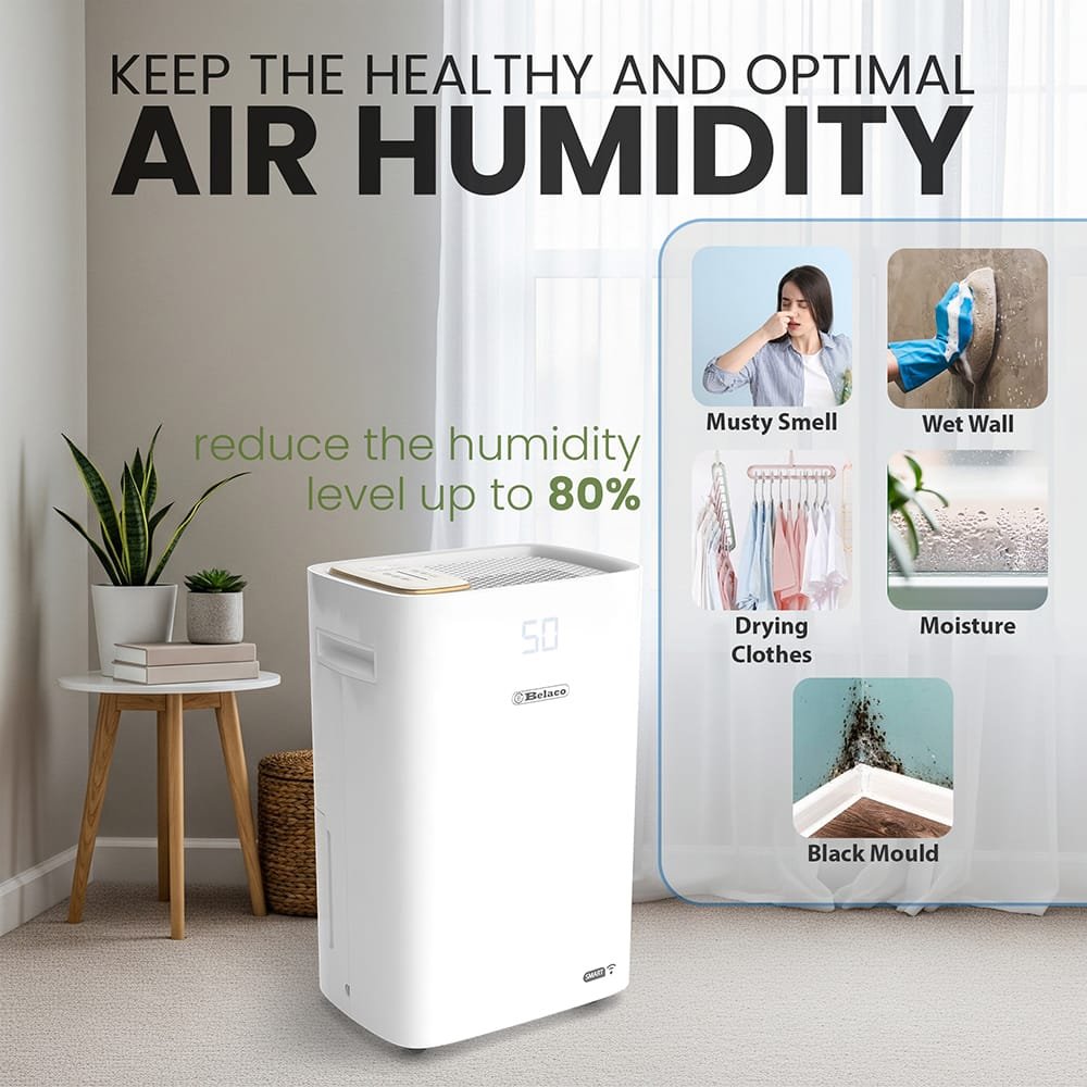 The Belaco 20L Day Dehumidifier is a compact and efficient solution designed for various spaces, including homes, offices, bedrooms, and bathrooms.
